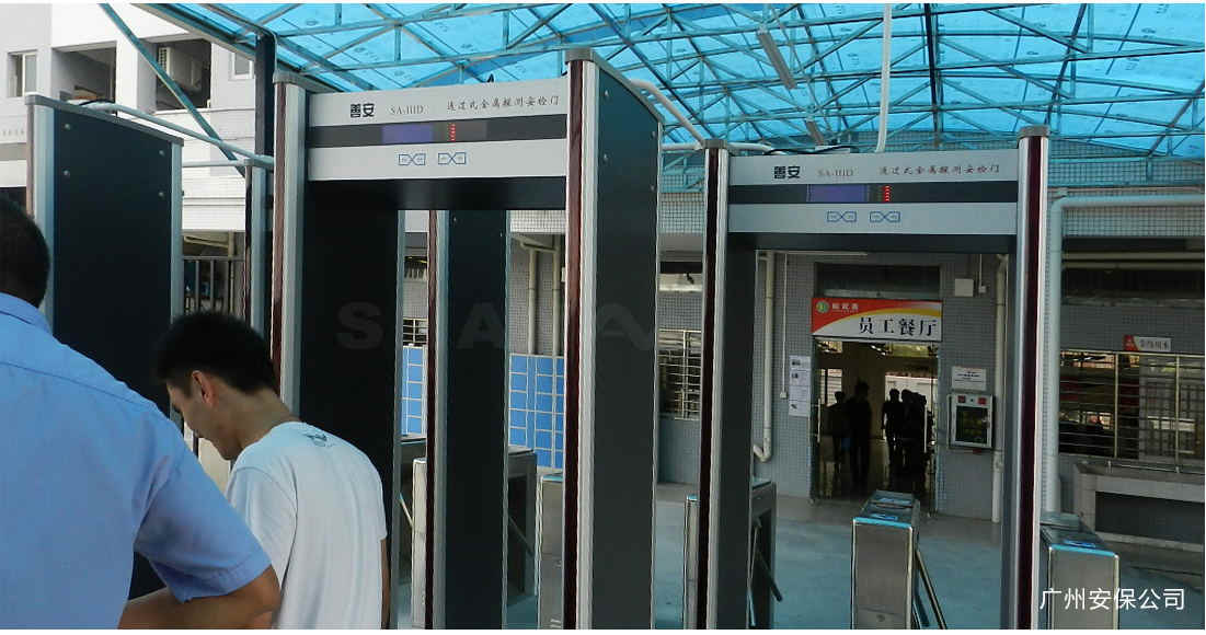 通過式金屬探測器,門中建立有電磁場,當人體攜帶金屬物品通過時能產生報警的裝置,能準確探測到人身上或手提包箱中攜帶的金屬物品或含有金屬的物品,如各種管制刀具、武器、金屬制品、電子產品及其他含有金屬的物品等,用來進行安全檢查、防偷竊檢查的一種有效工具。能有效避免傳統人工搜身檢查帶來的人權糾紛.