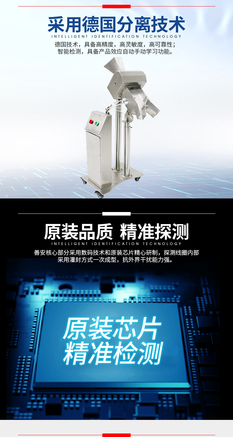Replace manual detection 具備產品效應自動手動學習功能;集成金屬異物快速剔除系統, 適合檢測散料產品,即使金屬被密封在產品中也能檢測出來。