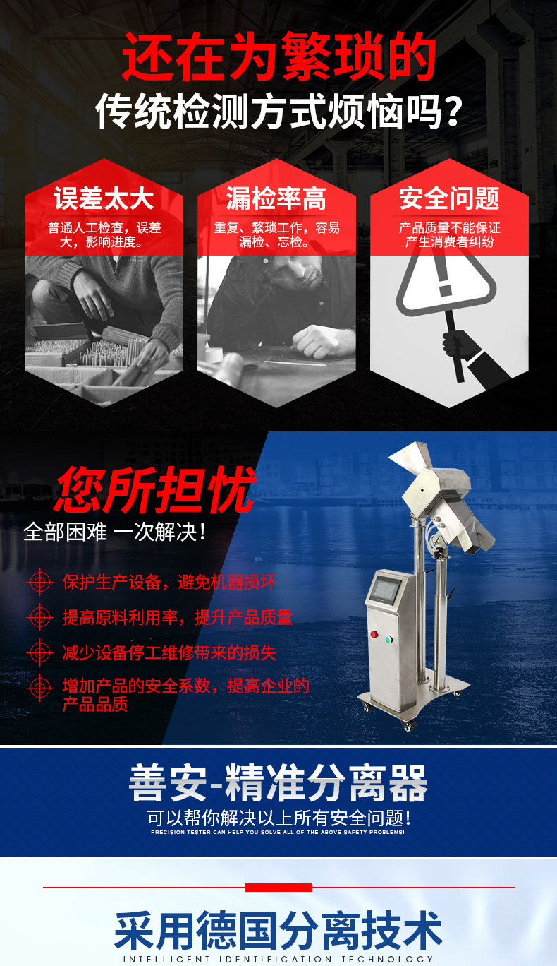 金屬分離器作用于檢測和分離混在食品、藥品、塑料、化工原料、食品原料等行業中的所有金屬,包括鐵類及非鐵類金屬(如銅、鋁、不銹鋼)等。及時分離金屬雜質,減少停機維修事故,增加工作效率,從而減低成本