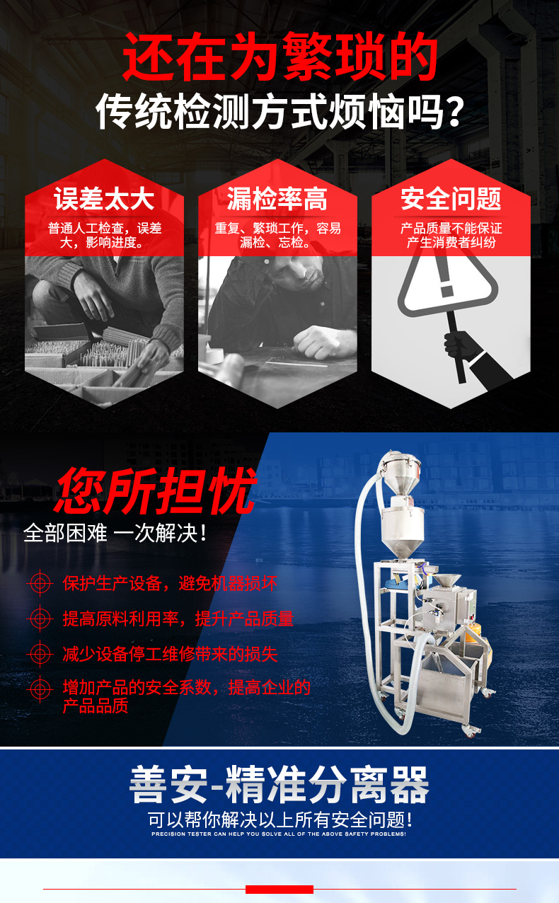 金屬分離器作用于檢測和分離混在食品、藥品、塑料、化工原料、食品原料等行業中的所有金屬,包括鐵類及非鐵類金屬(如銅、鋁、不銹鋼)等。及時分離金屬雜質,減少停機維修事故,增加工作效率,從而減低成本