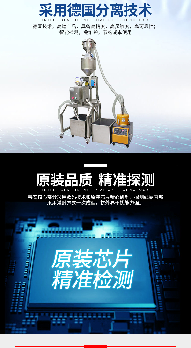 Replace manual detection 具備產品效應自動手動學習功能;集成金屬異物快速剔除系統, 適合檢測散料產品,即使金屬被密封在產品中也能檢測出來。