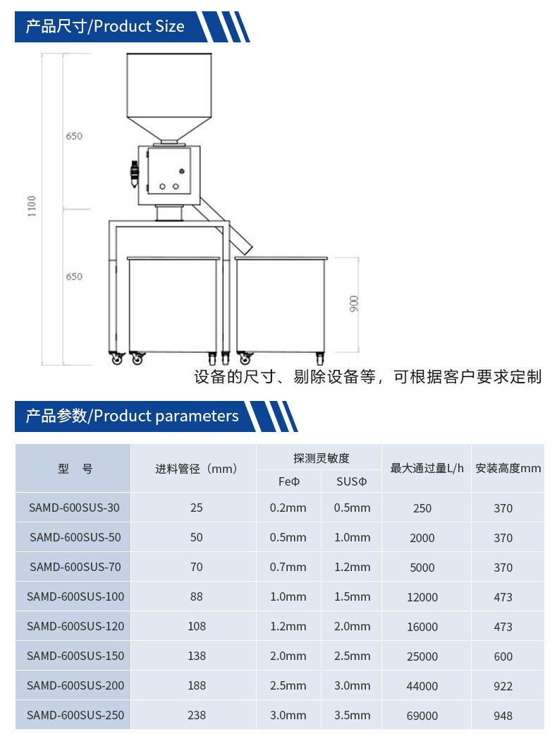 | 1 | 金屬分離器外殼和直接接觸產品部分的金屬材質都采用不銹鋼304制造; |