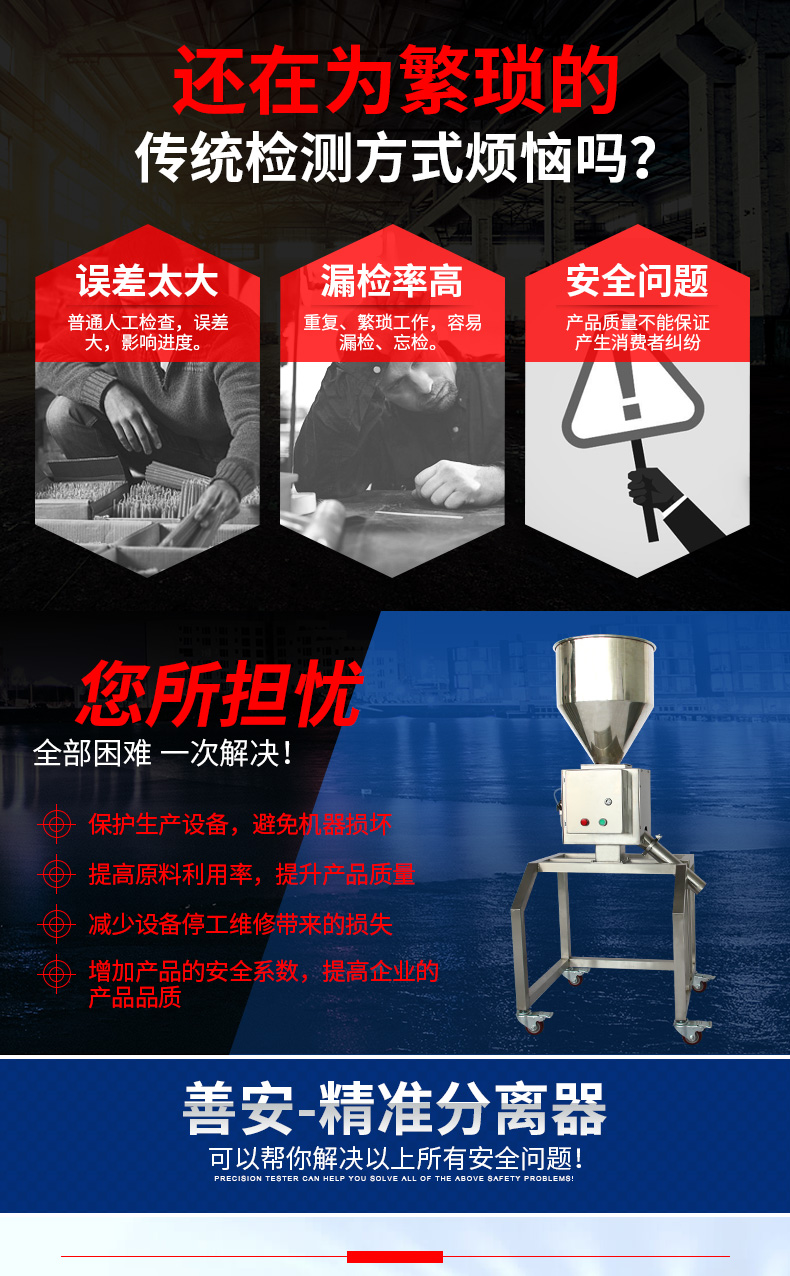 金屬分離器作用于檢測和分離混在食品、藥品、塑料、化工原料、食品原料等行業中的所有金屬,包括鐵類及非鐵類金屬(如銅、鋁、不銹鋼)等。及時分離金屬雜質,減少停機維修事故,增加工作效率,從而減低成本