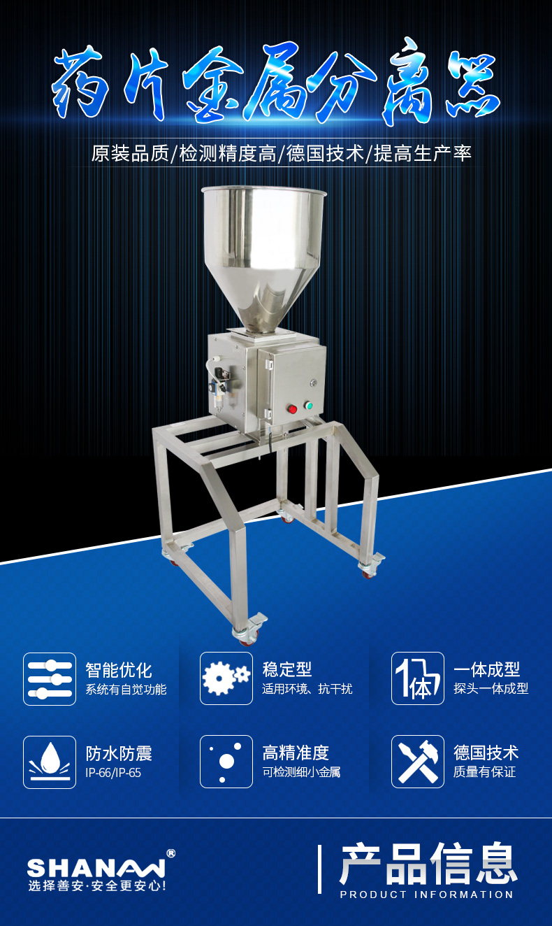 | 2 | SHANAN金屬分離器是采用德國技術生產的金屬分離器,能分離出原料中含磁性和非磁性的金屬(如鐵、銅、鋁、不銹鋼等)。 |