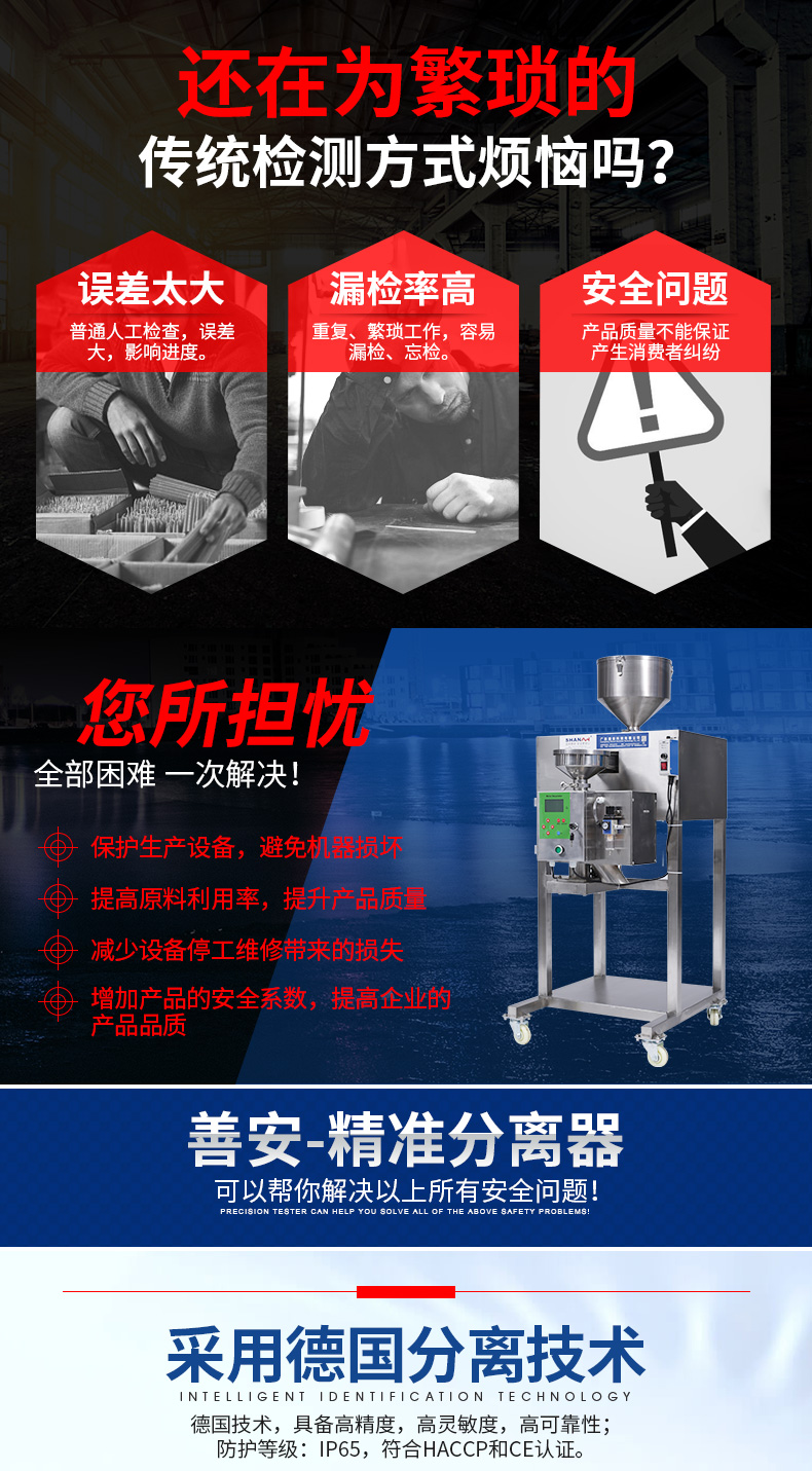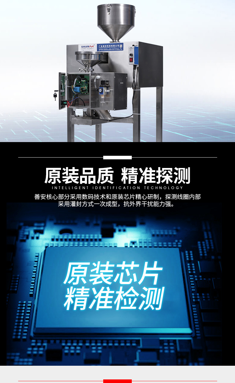 Replace manual detection 具備產品效應自動手動學習功能;集成金屬異物快速剔除系統, 適合檢測散料產品,即使金屬被密封在產品中也能檢測出來。