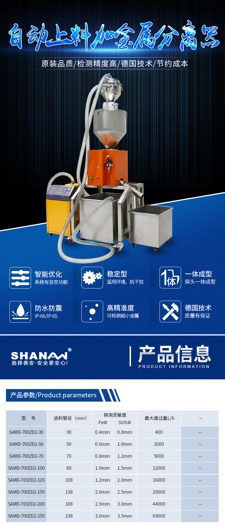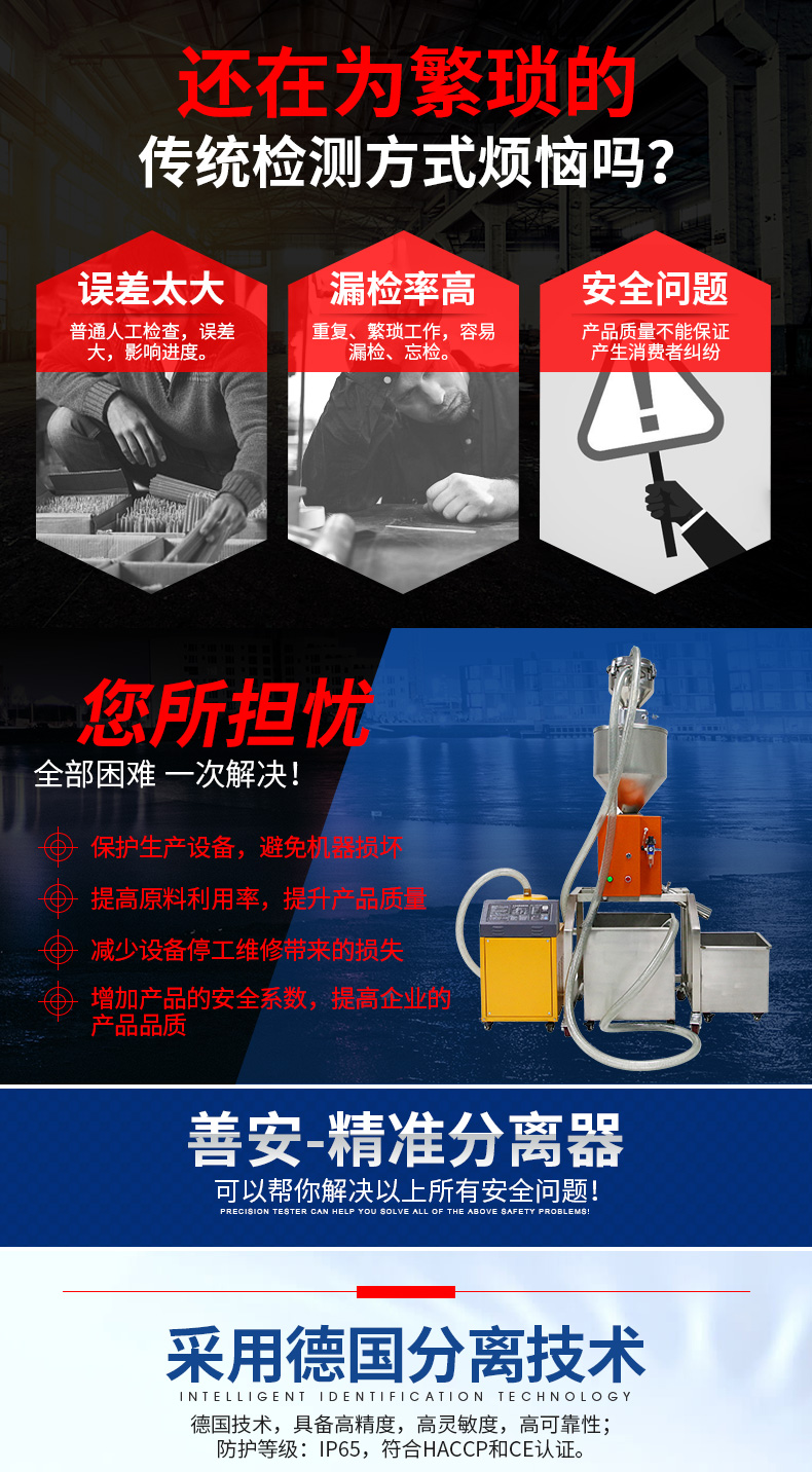 金屬分離器作用于檢測和分離混在食品、藥品、塑料、化工原料、食品原料等行業中的所有金屬,包括鐵類及非鐵類金屬(如銅、鋁、不銹鋼)等。及時分離金屬雜質,減少停機維修事故,增加工作效率,從而減低成本