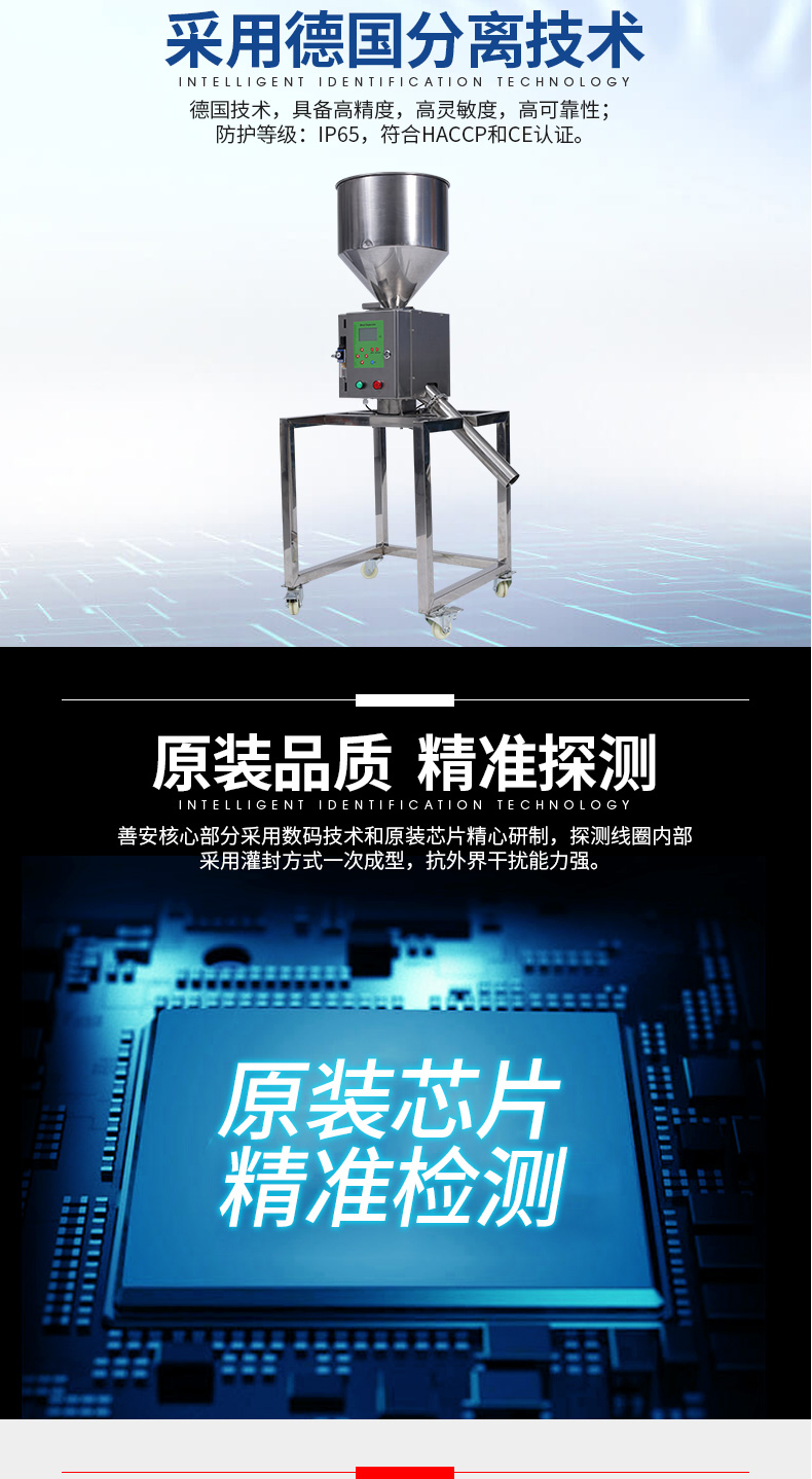Replace manual detection 具備產品效應自動手動學習功能;集成金屬異物快速剔除系統, 適合檢測散料產品,即使金屬被密封在產品中也能檢測出來。