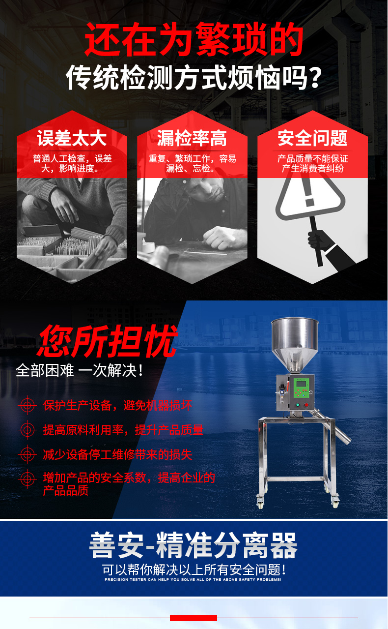 金屬分離器作用于檢測和分離混在食品、藥品、塑料、化工原料、食品原料等行業中的所有金屬,包括鐵類及非鐵類金屬(如銅、鋁、不銹鋼)等。及時分離金屬雜質,減少停機維修事故,增加工作效率,從而減低成本