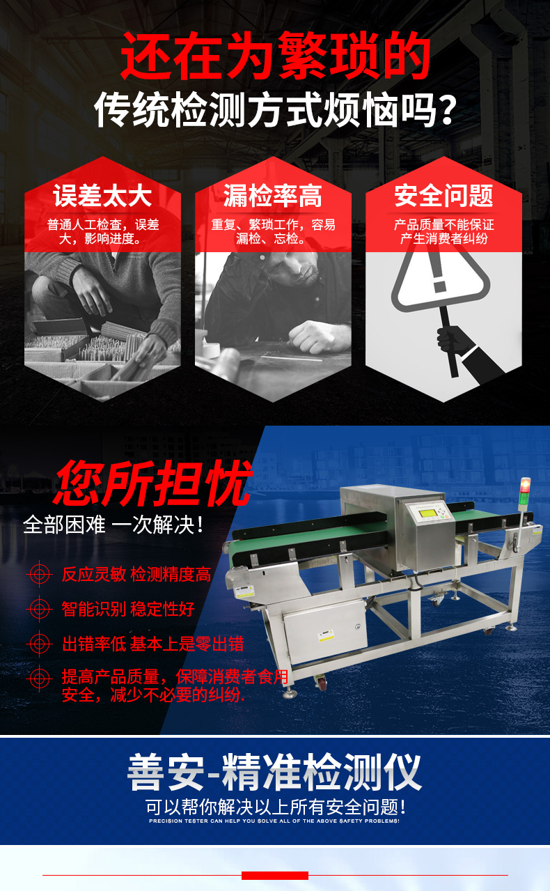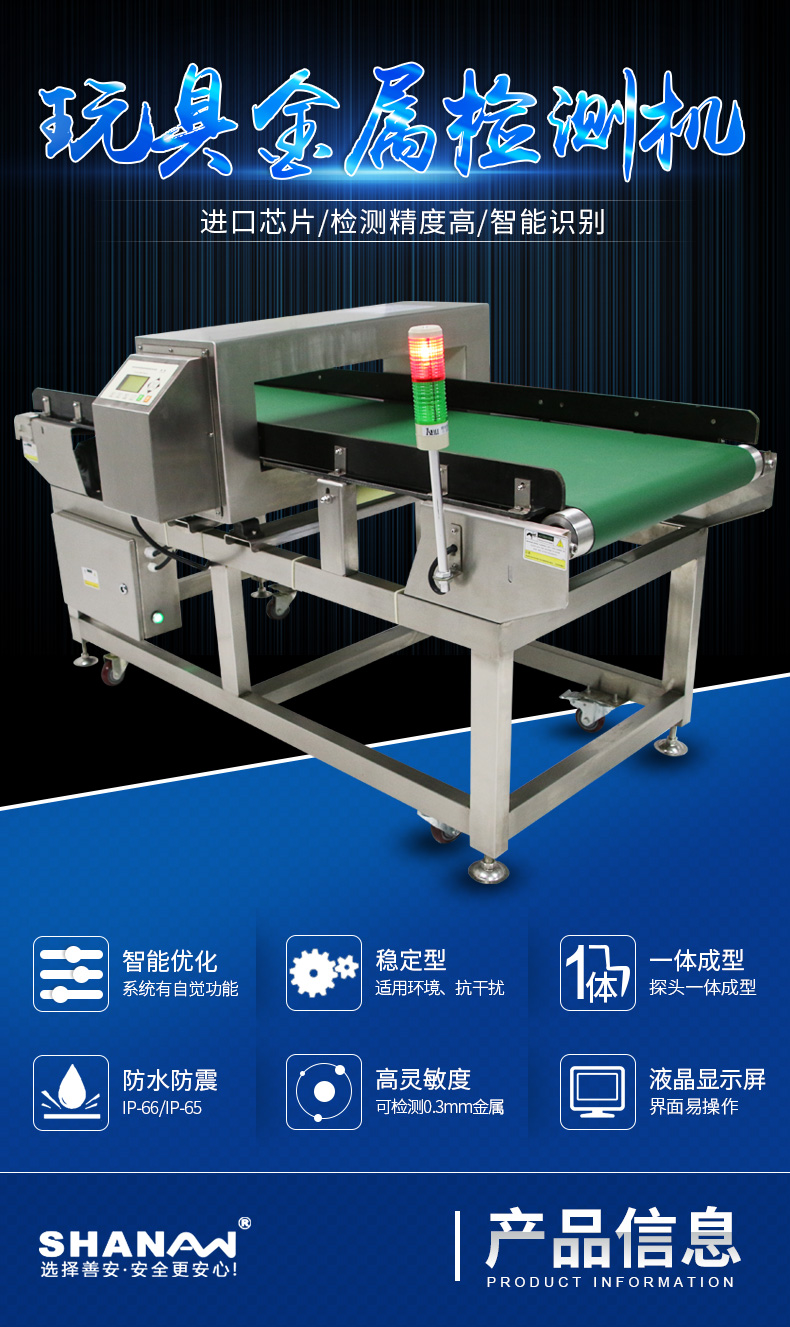 食品、藥品、水產品、玩具、服裝、制鞋、化工、皮革、針織、印刷等行業檢測產品或原料在生產過程中混入的金屬雜質。如:鐵、非磁性金屬物品(金、銀、銅、鋁、不銹鋼等有色金屬都可以檢測出),提高產品安全系數,減少危害。
