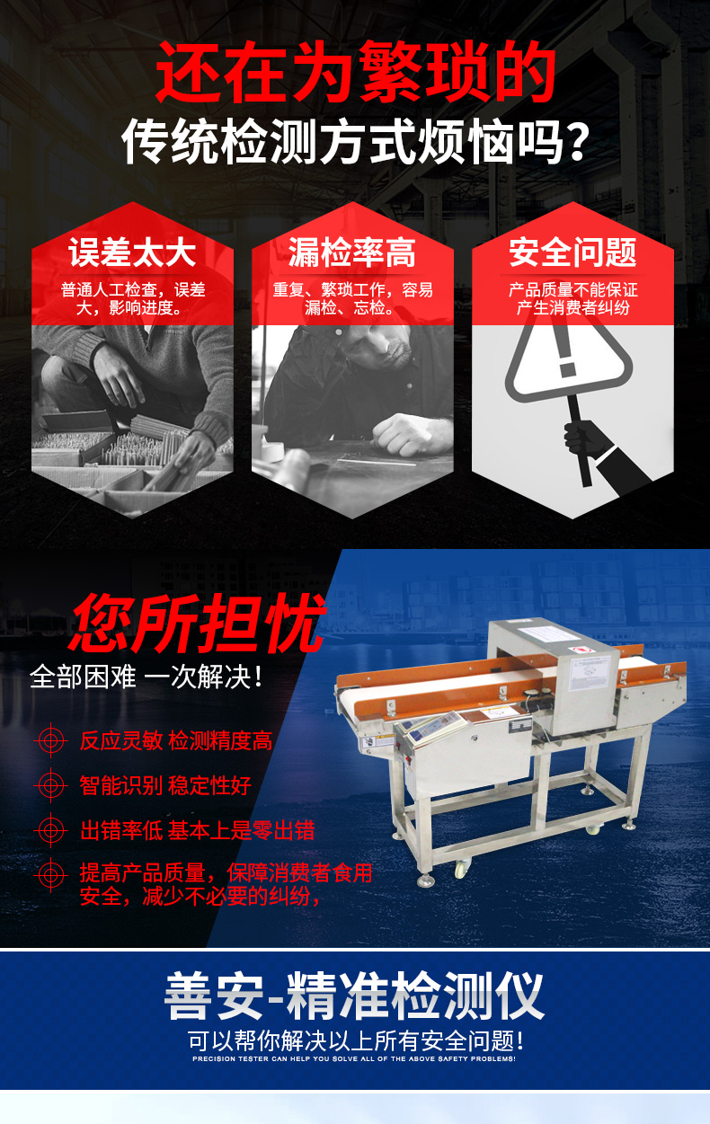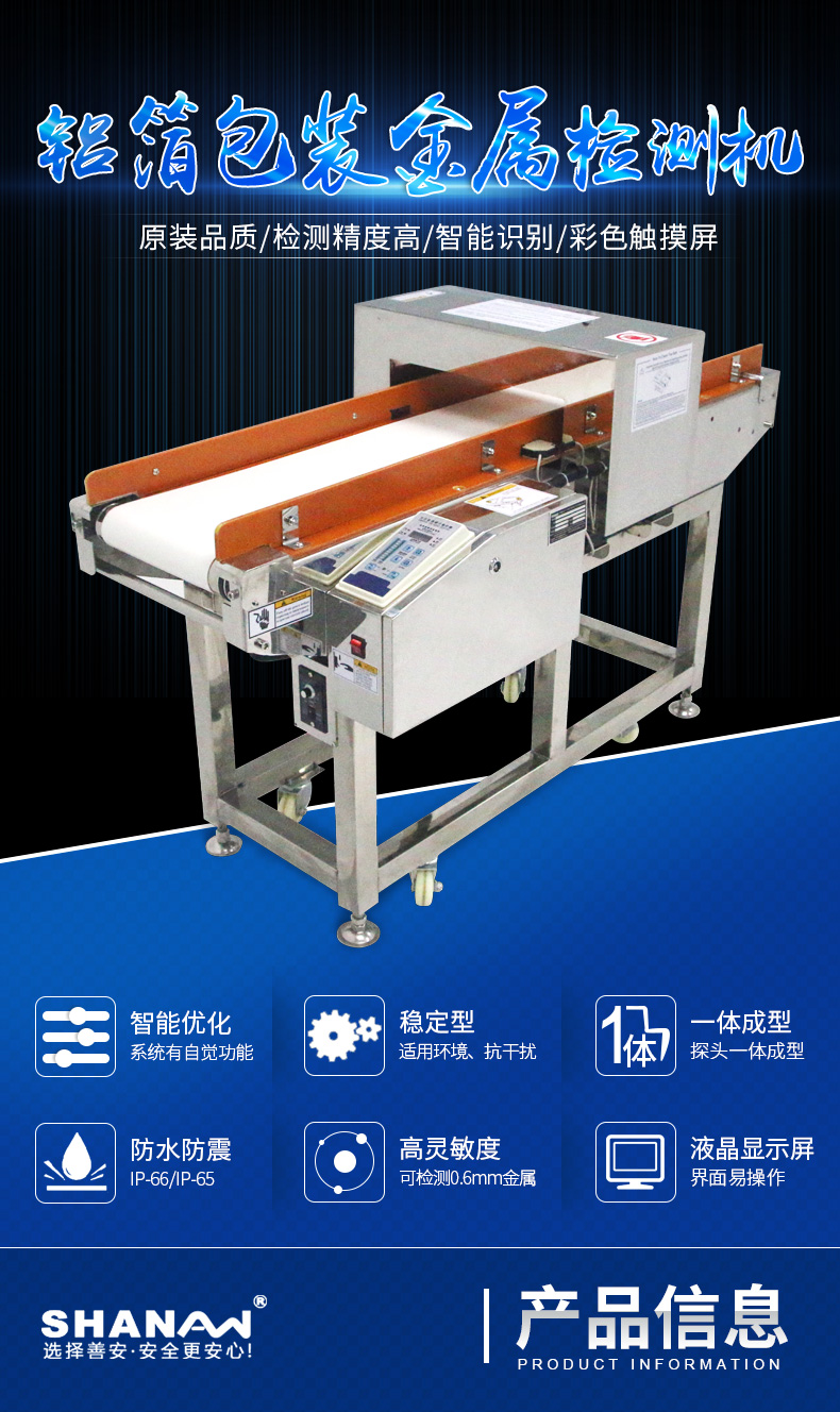 食品、藥品、水產品、玩具、服裝、制鞋、化工、皮革、針織、印刷等行業檢測產品或原料在生產過程中混入的金屬雜質。如:鐵、非磁性金屬物品(金、銀、銅、鋁、不銹鋼等有色金屬都可以檢測出),提高產品安全系數,減少危害。