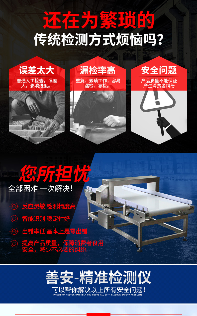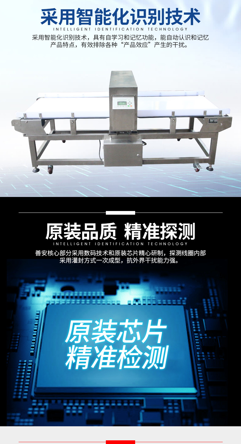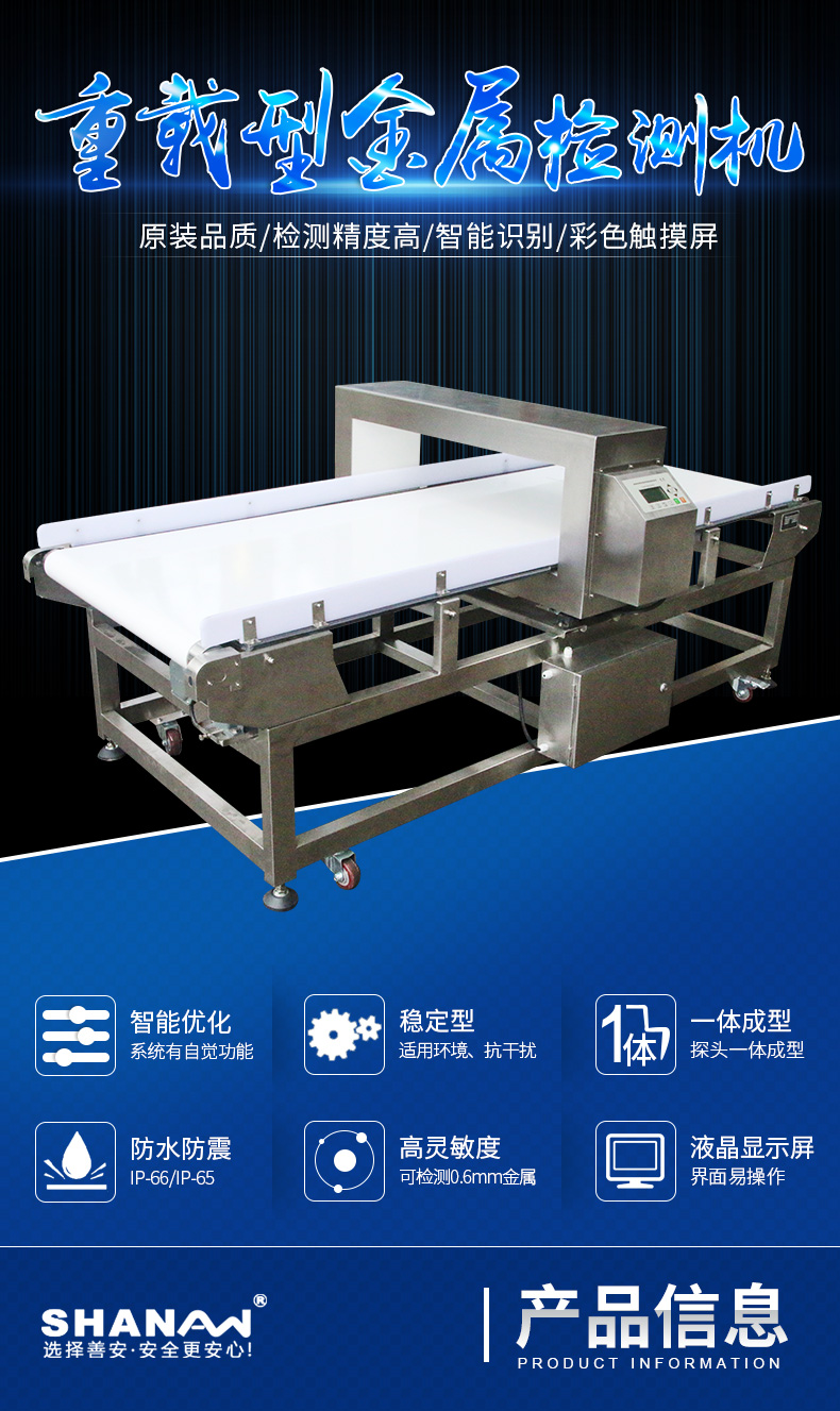 食品、藥品、水產品、玩具、服裝、制鞋、化工、皮革、針織、印刷等行業檢測產品或原料在生產過程中混入的金屬雜質。如:鐵、非磁性金屬物品(金、銀、銅、鋁、不銹鋼等有色金屬都可以檢測出),提高產品安全系數,減少危害。