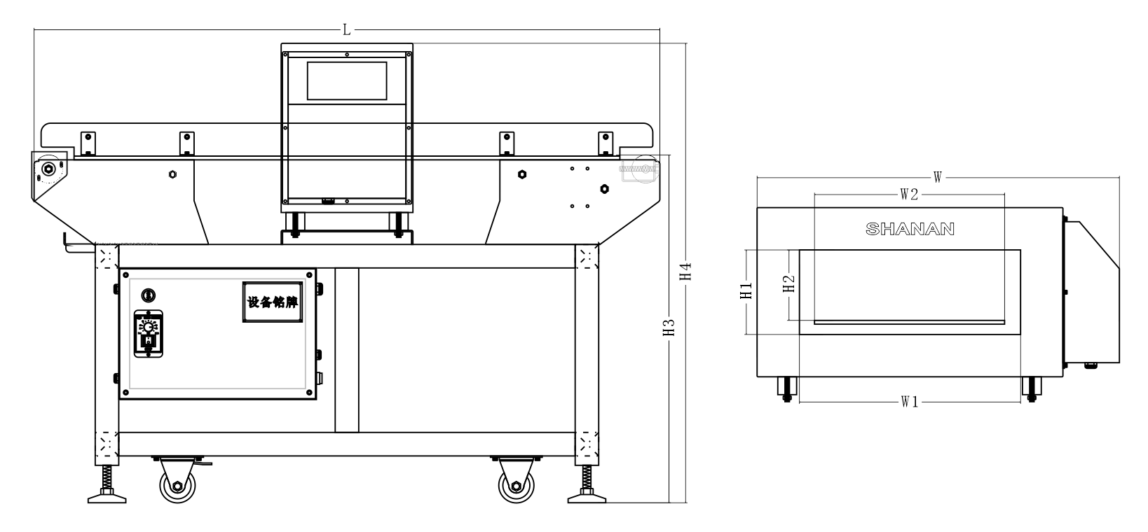 W1:檢測通道開口寬度 H3:輸送帶面距離離地面高度