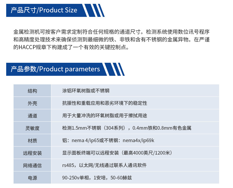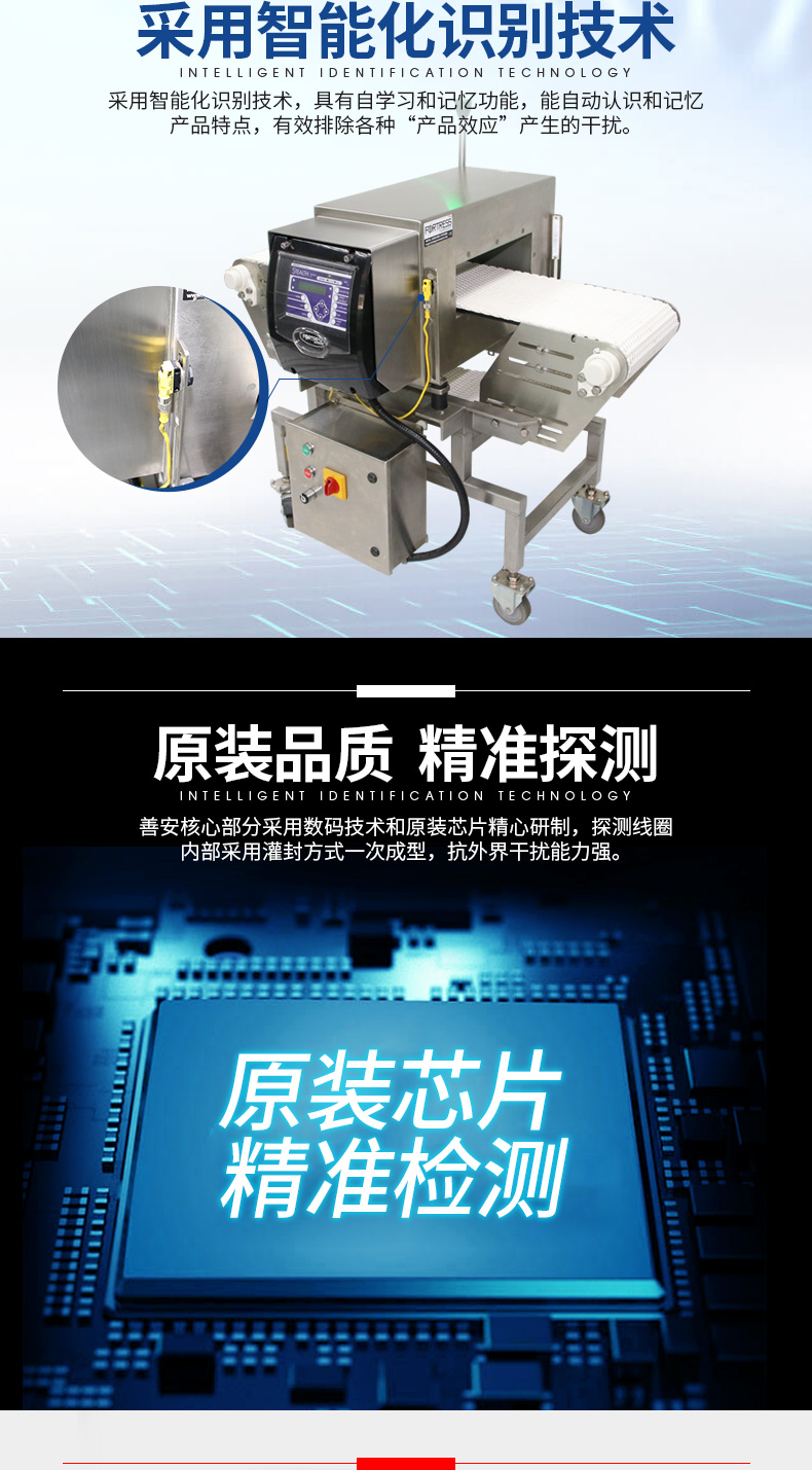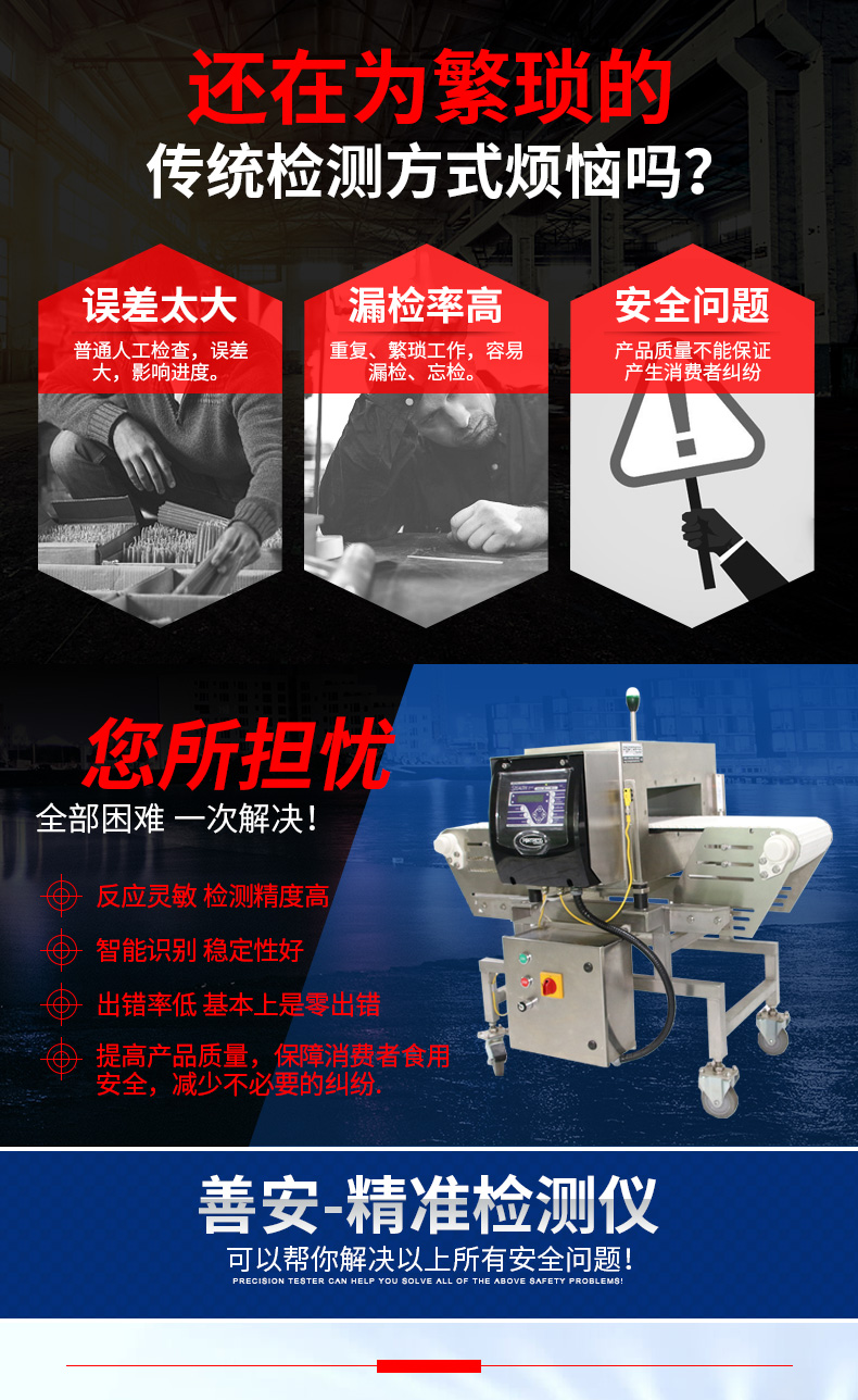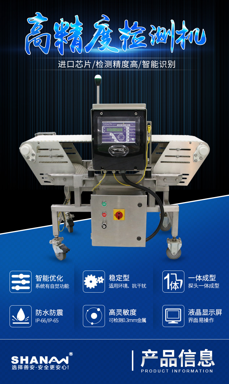 食品、藥品、水產品、玩具、服裝、制鞋、化工、皮革、針織、印刷等行業檢測產品或原料在生產過程中混入的金屬雜質。如:鐵、非磁性金屬物品(金、銀、銅、鋁、不銹鋼等有色金屬都可以檢測出),提高產品安全系數,減少危害。